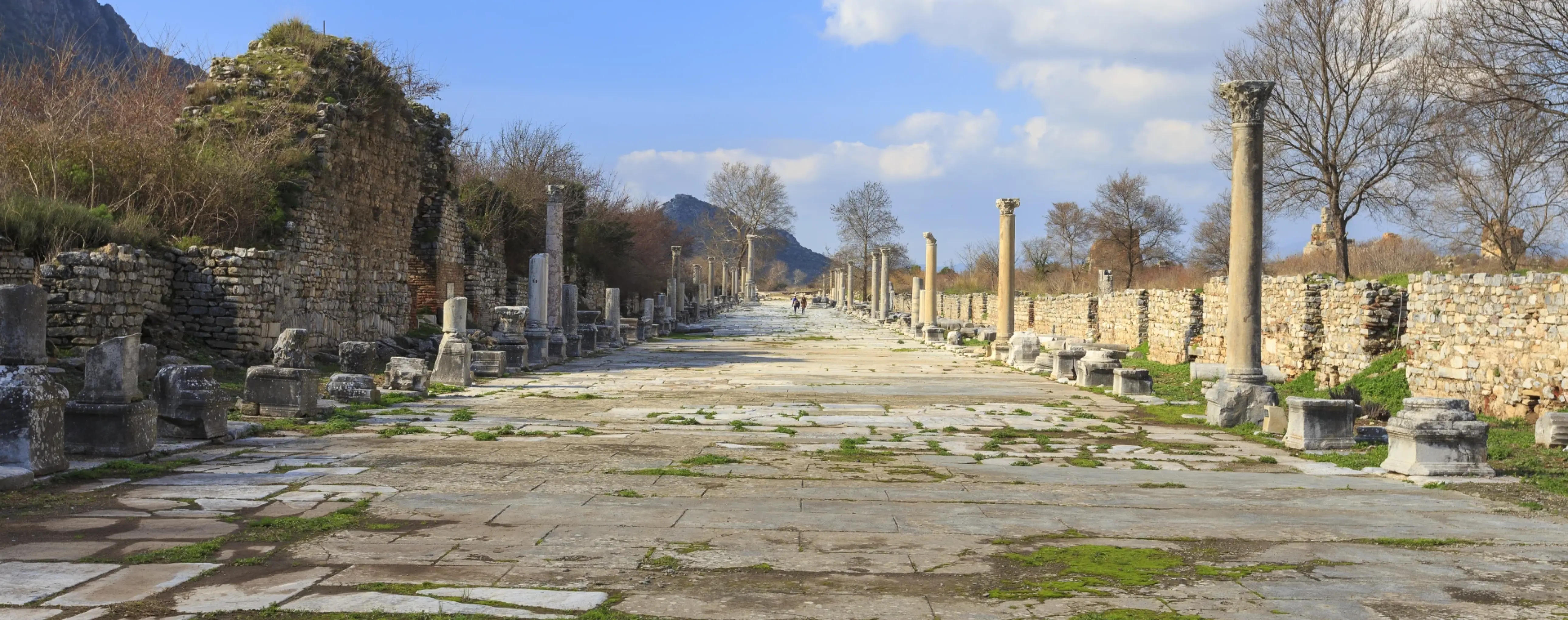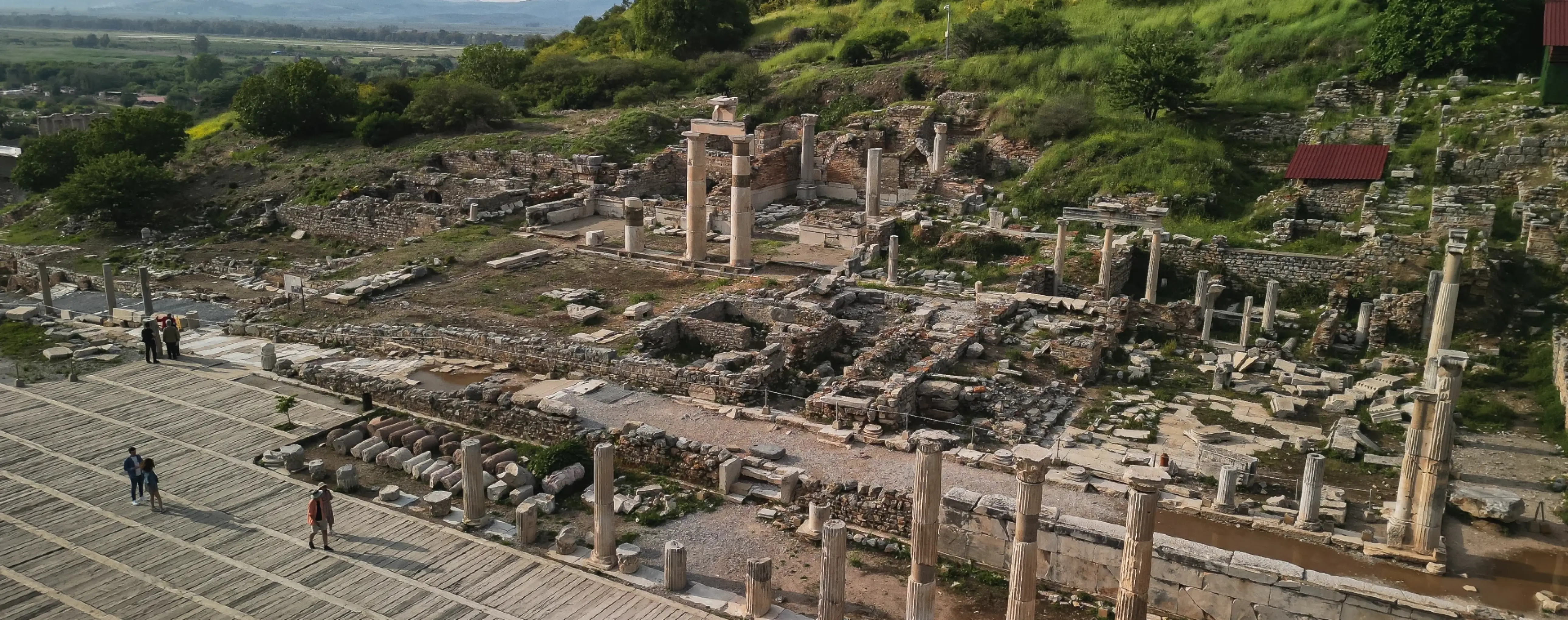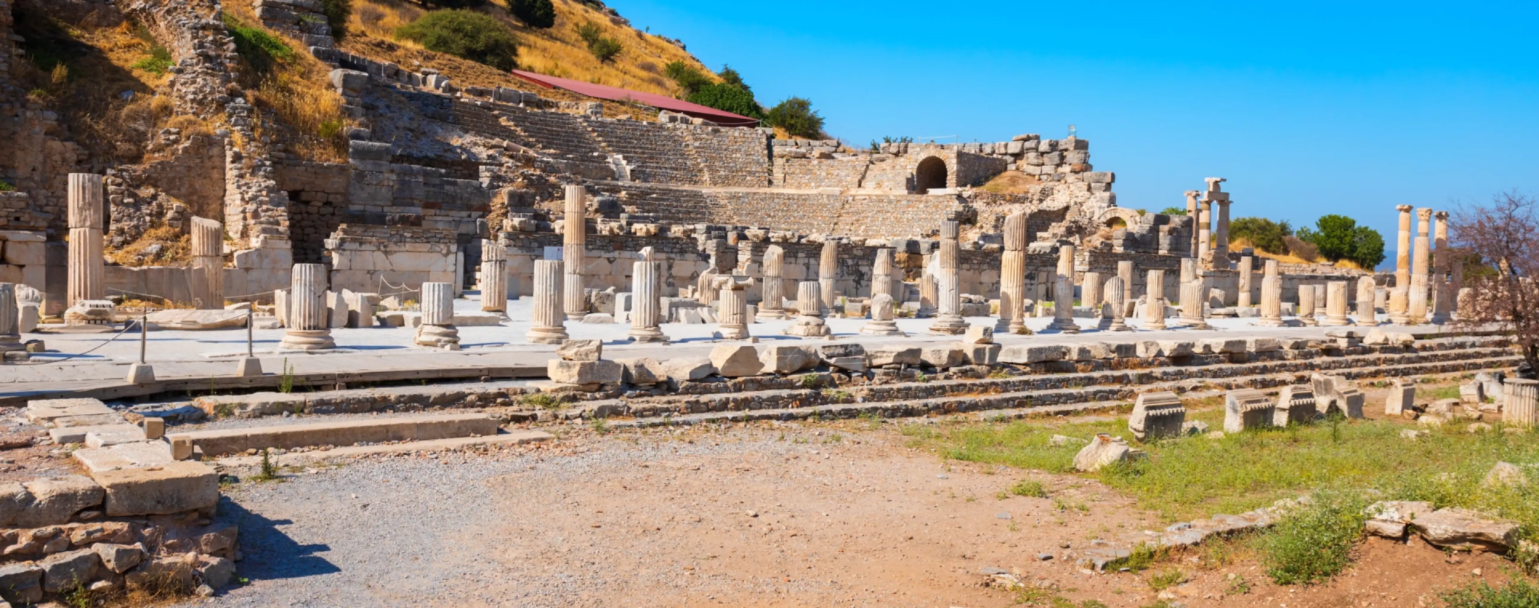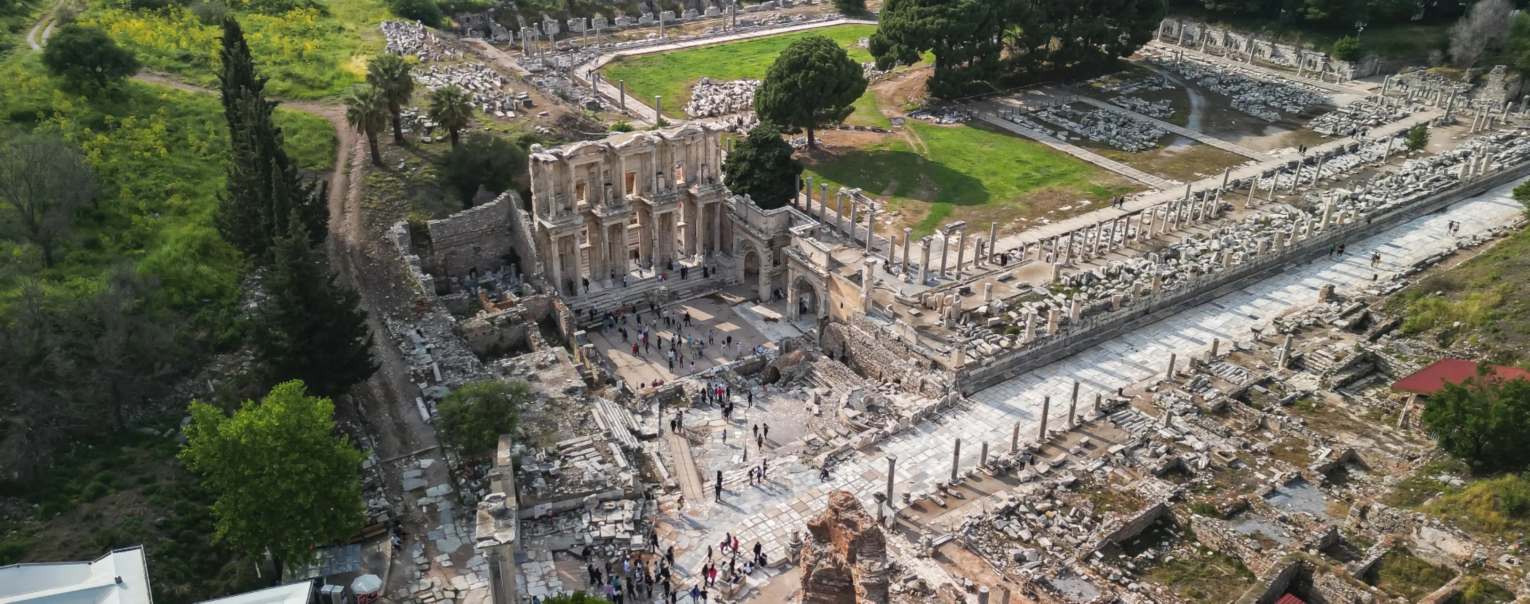 As an urban environment, Ephesus is a large, open archaeological park without blocks of modern buildings or typical city streets and squares. The space is open and sunny, and the main monuments are linked by a walking route along the ancient city's main thoroughfares. Some areas have shade structures, and there are ticket offices and basic services at the entrances.