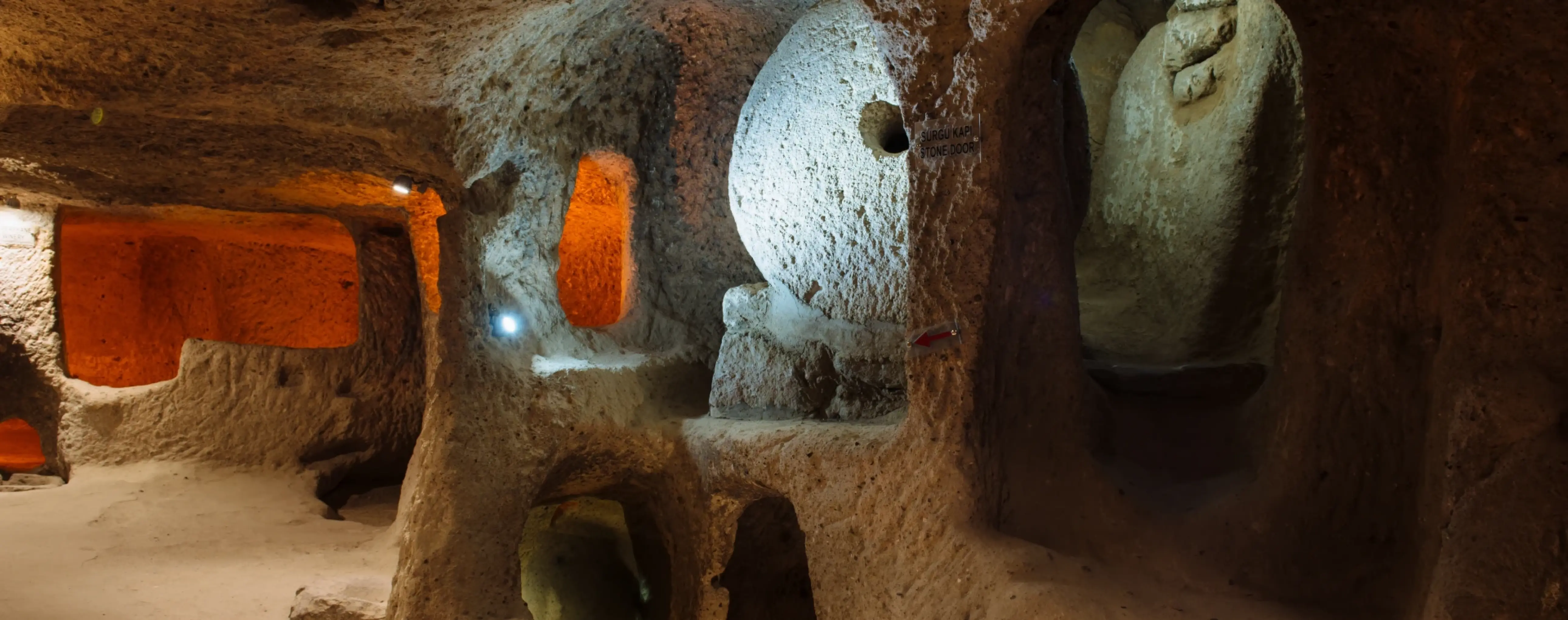 Several underground levels are known at Kaymakli, connected by corridors, stairways, and vertical shafts. Ventilation channels, utility rooms, storage areas, spaces for keeping animals, living quarters, and religious spaces have been preserved here. Massive round stone doors were used to protect the inner passageways, and the layout of the complex shows how carefully life underground was organized.