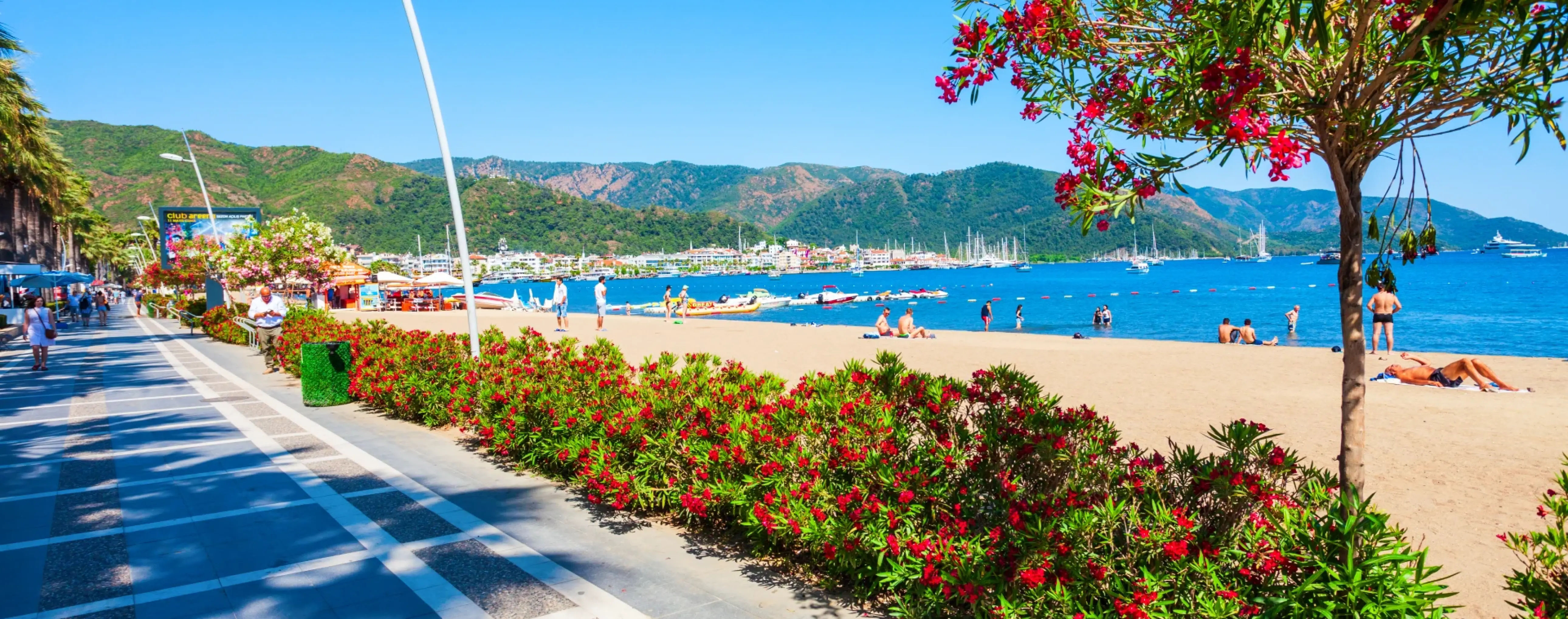 The Marmaris Promenade stretches along the shore in the central part of the city of Marmaris, in the Marmaris Center area, and is one of the resort’s most notable public spaces. It runs along the bay, connecting sections of beach, marina areas, and lively urban quarters. From here, there are views of the sea, sightseeing boats and yachts, as well as the hills surrounding the bay.